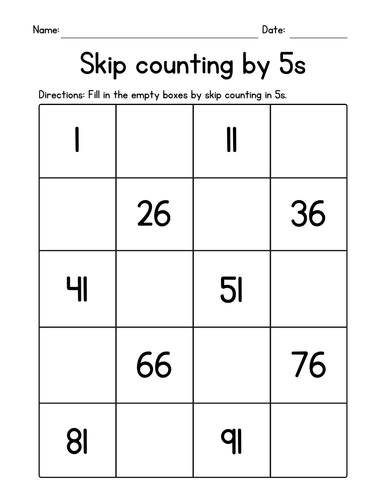 Search Printable Skip Counting by 5 Worksheets - Education With these energizing worksheets, students will focus on one of the most common math patterns—skip counting by 5's! This rich worksheet collection features number charts, dot-to-dot pictures, fill-in-the-blank exercises, and money math with nickels. Skip counting by 5's is a fun way to build on students' counting and pattern recognition skills.
